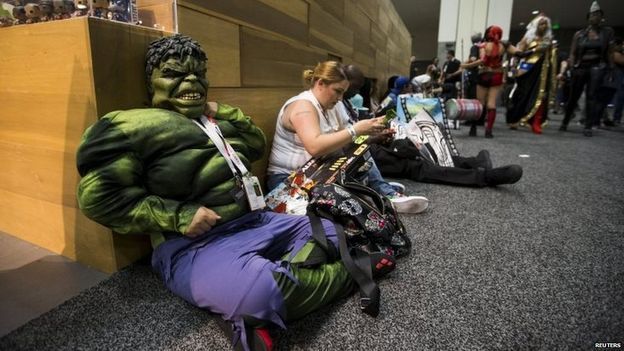 É comum na Comic-Con que fãs compitam para tirar fotografias com cosplayers masculinos e femininos nas salas abarrotadas do Centro de Convenções de San Diego.